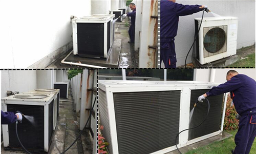 ;所有工具準備就緒,便開始清洗空調(diào)外機。首先吳工切斷空調(diào)的電源,防止觸電。然后用高壓水槍沖洗,把空調(diào)外機翅形鋁箔散熱片也就是溫度交換器沖洗干凈,在沖洗的時候由上向下進行沖洗,注意要避免水流入到風扇軸承導(dǎo)致潤滑不良。