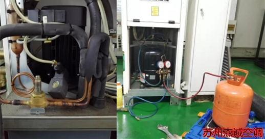 等丹弗斯膨脹閥到貨后立馬驅(qū)車到客戶公司進行冷水機維修,打開冷水機外殼,將壓縮機的冷媒先放掉,途中發(fā)現(xiàn)冷媒都呈液態(tài),詢問客戶才得知之前找過其他人來維修,說冷水機缺冷媒,加了冷媒。