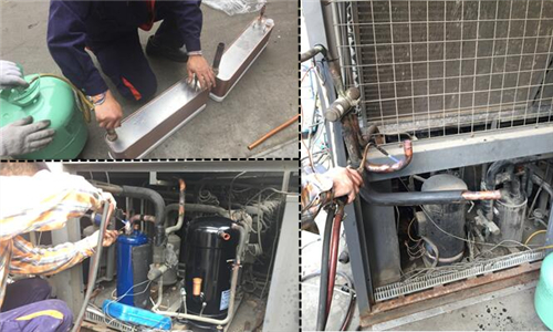此次出現(xiàn)故障的機器是2號車間外的1號冷水機和6號冷水機。第一天,顧工、楊工通力合作檢查,發(fā)現(xiàn)是壓縮機故障引起,需要更換配件。將故障壓縮機、貯液器等設備拆卸下來,用絕緣膠帶將銅管口封上,以防灰層進入。將型號信息反饋回去,公司馬上從倉庫調(diào)度出所需設備,為第二天的維修工作做好準備。